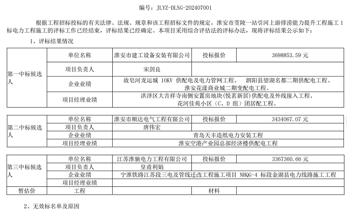 淮安市茭陵一站引河上游排澇能力提升工程施工1標(biāo)電力工程施工中標(biāo)候選人公示